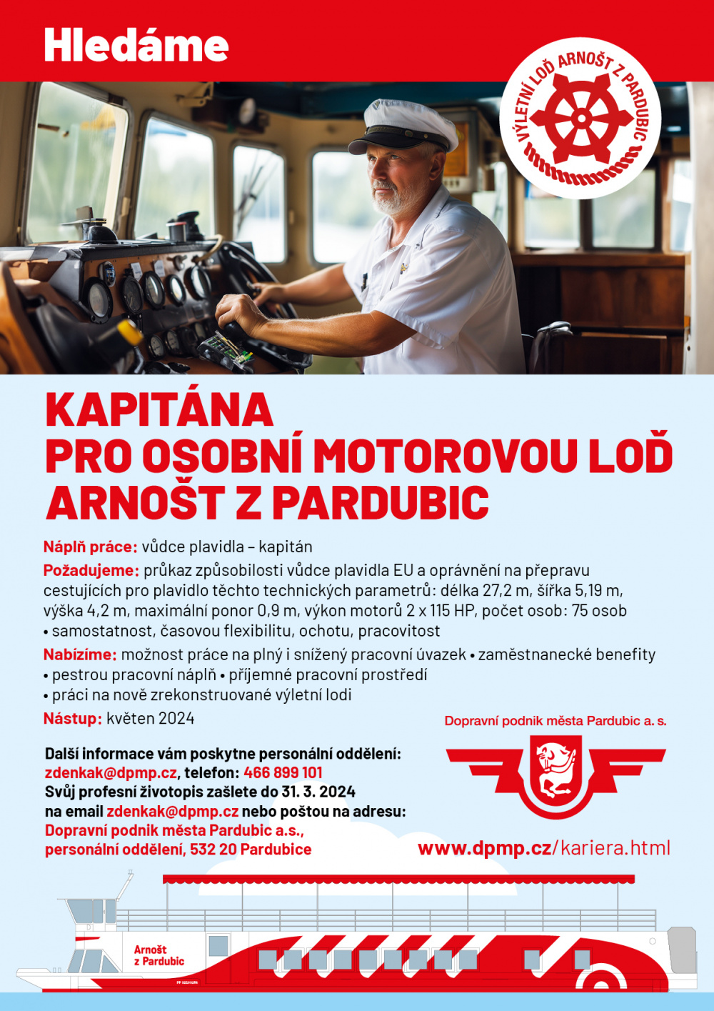 Hledáme: Kapitána pro osobní motorovou loď Arnošt z Pardubic
