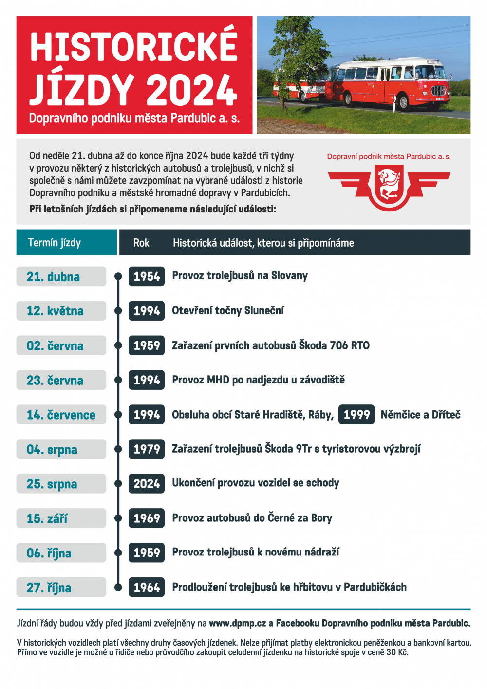 Od neděle 21. dubna až do konce října 2024 bude každé tři týdny v provozu některý z historických autobusů a trolejbusů, v nichž si společně s námi můžete zavzpomínat na vybrané události z historie Dopravního podniku a městské hromadné dopravy v Pardubicích.