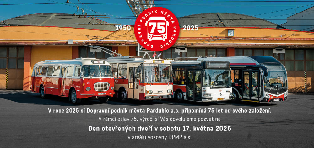 Dopravní podnik města Pardubic a. s. Vás zve na DEN OTEVŘENÝCH DVEŘÍ v sobotu 17. května 2025 od 9:00 do 15:00 hod. v prostorách areálu DPMP v Pardubicích na Dukle.