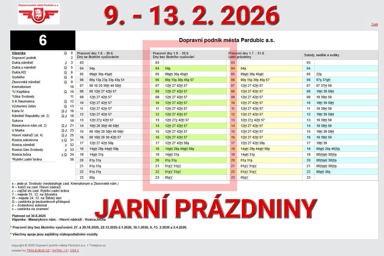 Na Pardubicku začnou jarní prázdniny. Od pondělí 9.2. do pátku 13.2.2026 tak jezdíme podle zeleného sloupce jízdních řádů!
