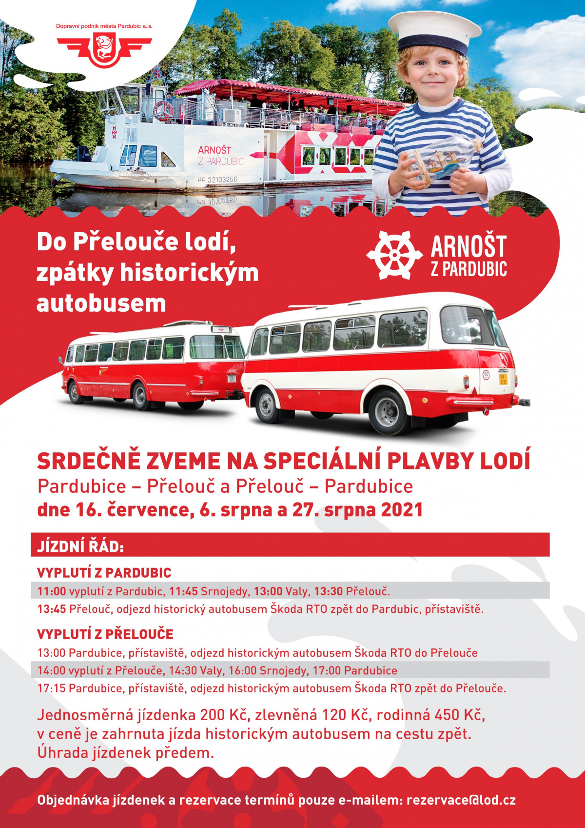 Hned ve tři prázdninové pátky můžete vyrazit buď lodí Arnošt z Pardubic do Přelouče a zpět autobusem Škoda 706 RTO nebo naopak lodí do Pardubic a autobusem zpět do Pardubic.